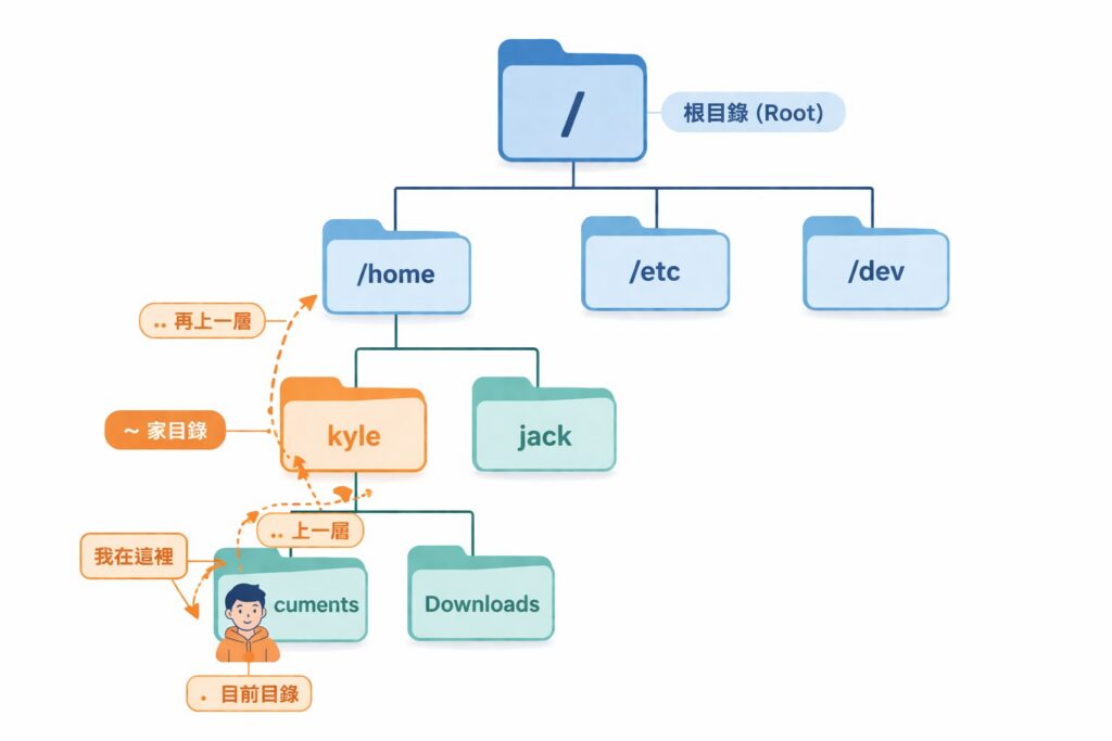 在 Linux 與 macOS 的終端機中,有幾個特殊符號代表著不同的目錄位置,這些符號在操作上非常常用,先來一一認識。