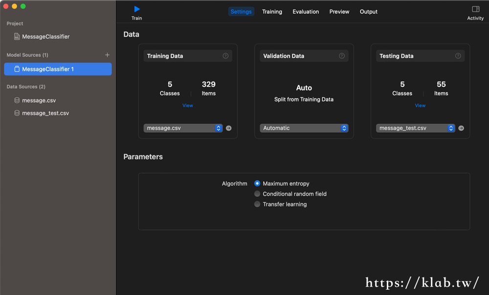 在Setting頁籤會要我們選擇Training Data(訓練資料)、Validation Data(驗證資料)、Testing Data(測試資料),在Training Data選擇message.csv,Validation Data保留Auto不動,然後Testing Data選擇message_test.csv。