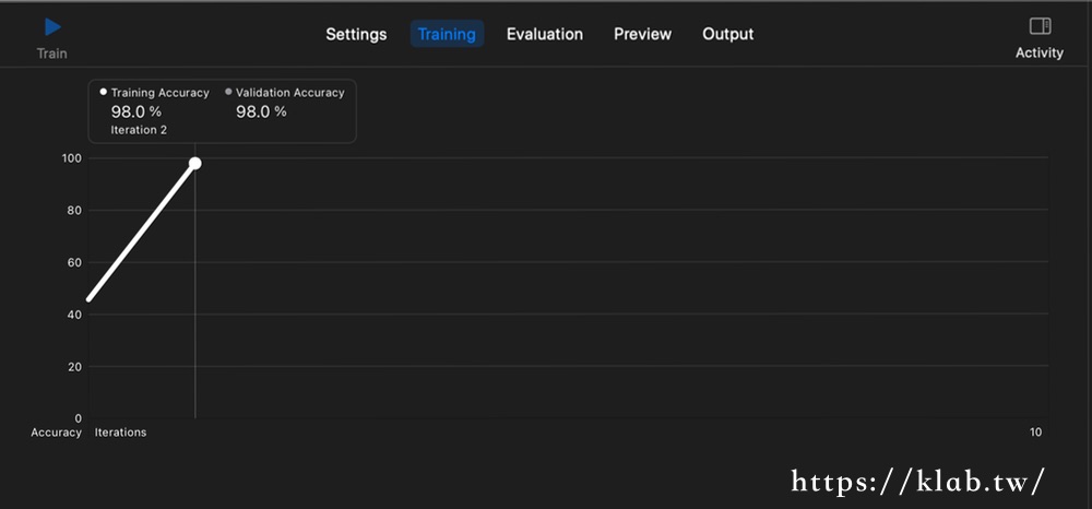 接下來點選左上角的「Train」按鈕就會開始訓練了,訓練中會跳到Training頁籤,從畫面上看到經過2輪的訓練後正確率達到98%,因此自動結束了。
