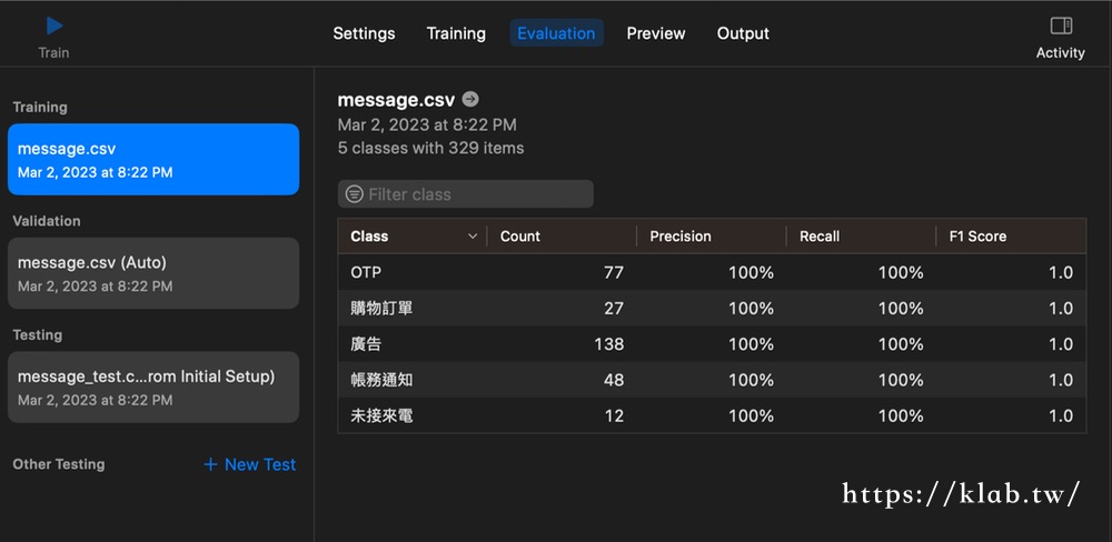切換到Evaluation頁籤可以看到訓練的結果,然後我們再切換到Preview頁籤就可以直接使用這個模型來預測新的文字內容了。