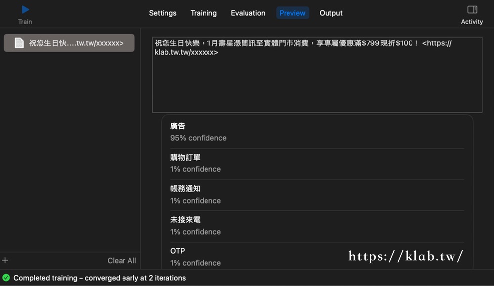 這邊我使用的是M2版MacBook Air,但就算是最便宜的18,900元的Mac mini也能輕鬆應付文字分類的學習。後來我又試了一台2020年的Intel版MacBook Pro也是數秒內訓練完,幾百則的文字分類訓練毫無壓力。
