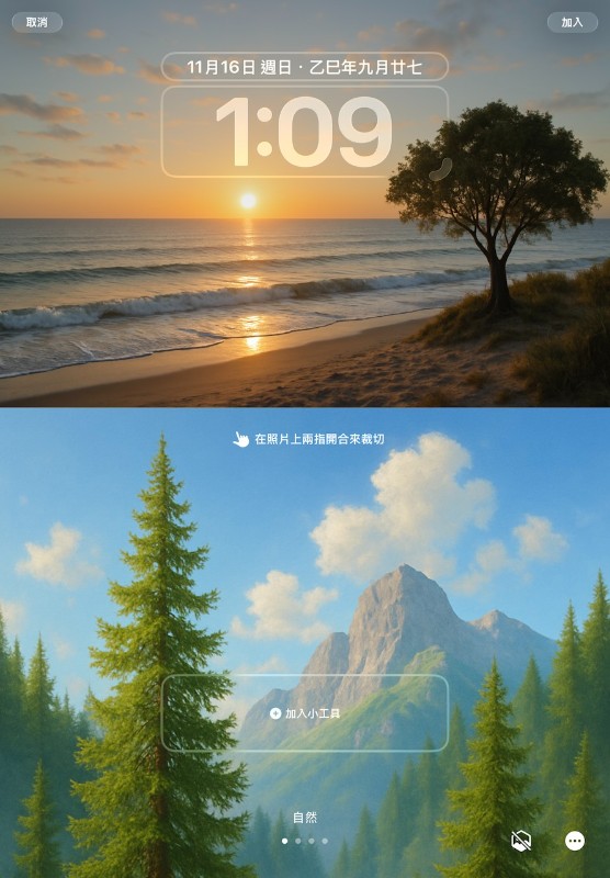 我們先處理直向畫面,這時候使用兩根手指頭將圖片整個往上拖動,讓圖片下方完整佔滿螢幕。完成後把 iPad 轉 90 度變成橫向模式,這次用兩根手指將圖片整個往下拖動,讓圖片上方完整佔滿螢幕。再點選右上角的「加入」就完成了!