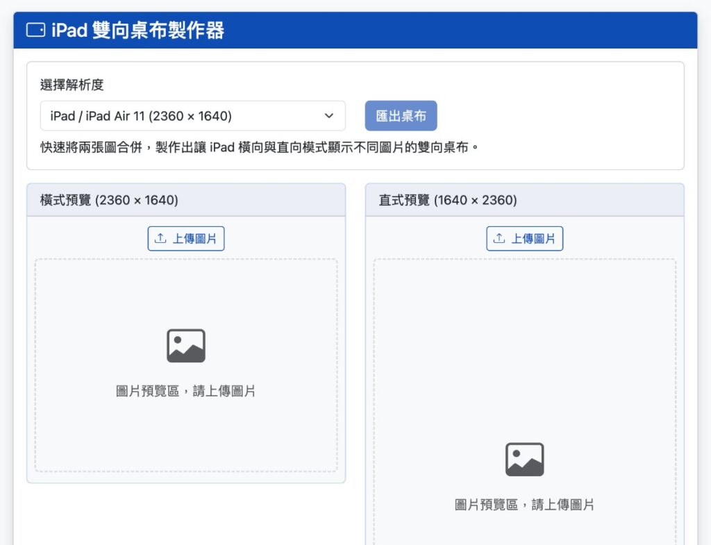 開啟 iPad 雙向桌布製作器 會看到以下畫面,可以使用電腦、平板、手機都可以操作。依照 iPad 的尺寸選擇解析度,已經預設了 iPad / iPad air 11吋 / iPad air 13吋 / iPad pro 11吋 / iPad pro 13吋 / iPad mini,如果是舊款也沒關係,螢幕的尺寸差不多,可以直接挑選一個最接近的即可。