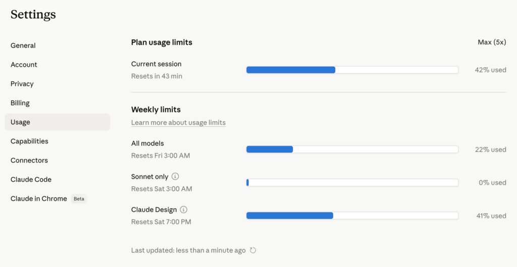 Claude Design 有一件務實的事要單獨講:它在「Settings → Usage」裡有獨立的使用額度,跟一般 Claude 聊天與 Claude Code 的額度是分開計算的。這句話有兩個方向的意義——好消息是,跑 Claude Design 不會吃掉日常聊天或 Claude Code 的配額;壞消息是,這份設計專用額度自己很容易見底,背後跑的是 Claude Opus 4.7,一次產出就包了多個頁面、多輪推理,燒 token 的速度相當驚人。